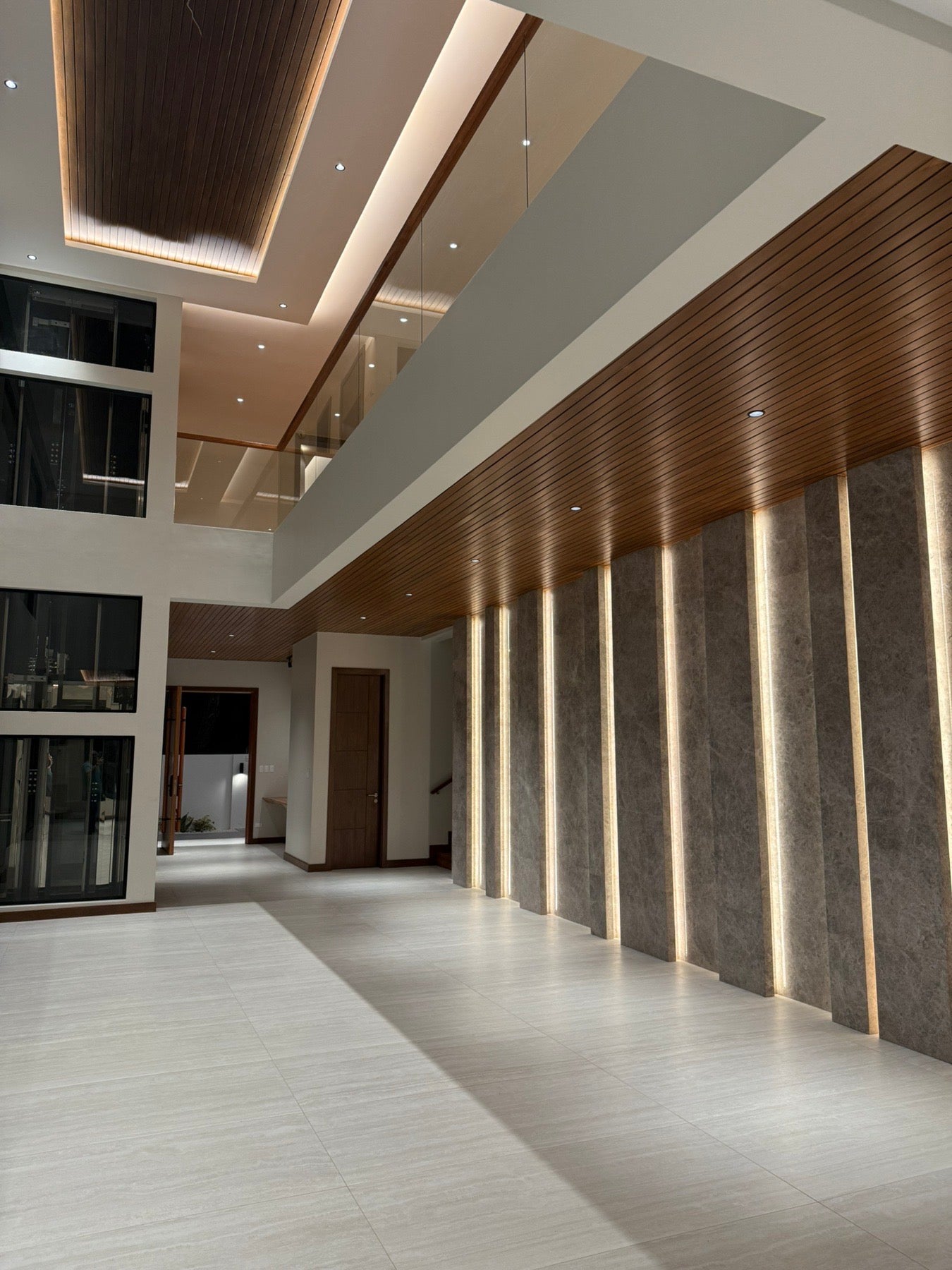 - High-ceiling living and dining areas